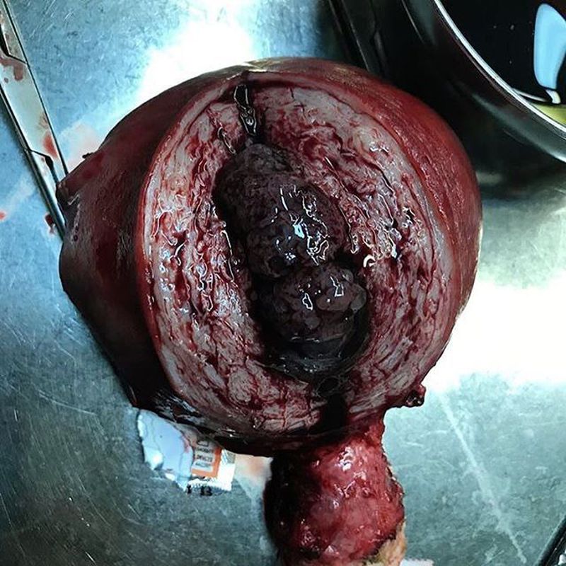 This is a resected uterus showing a molar pregnancy, or in more medically appropriate terms a gestational trophoblastic neoplasia. It's an abnormality of the placenta and happens when tissue that normally becomes a fetus instead becomes an abnormal growth inside the uterus. Even though it isn't an embryo, this growth triggers symptoms of pregnancy.It is the result of a genetic error during the fertilization process, with 2 main types - A benign or malignant types. Benign includes complete and incomplete pregnancies. In the complete form, a single sperm fertilizes an empty ovum so there's no fetal tissue present, while the incomplete form contains fetal tissue due to a normal ovum being fertilized by two sperms. The malignant form gives real troubles, it may progress into invasive moles and in some patients lead to choriocarcinoma with pulmonary and CNS metastasis and trophoblastic pulmonary emboli. Patients typically present with uterine bleeding and hyperemesis gravidum characterized by severe nausea, vomiting, weight loss, and electrolyte disturbance.Here's a giveaway to diagnosis, the tissue revealed resembles tiny grapes, a grape-like molar clusters, clearly seen above. Treatment includes evacuation of the uterus, using chemotherapy (e.g. Methotrexate) if malignant, and hysterectomy to treat residual uterine disease and if no other pregnancies are wished. Photo by @sanaatbaei