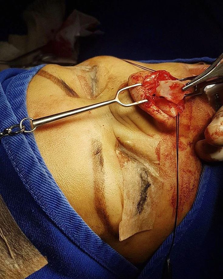 This is an extremely delicate surgical intervention to correct both the external shape of the nose and the deviation of the septum in order to obtain good nose functionality. Shown above, a cartilage graft was taken from the septum of a 33-year-old patient with septum deviation, dorsal hump and collapse of the nasal tip. The graft was essentially used to correct the tip on her nose. She was unable to breath properly and desired to improve the functionality and external appearance of her nose. The use of cartilage graft from the septum addressed both issues and is the safest and most used technique for nasal tip reconstruction.Photo by @drjaviersoto