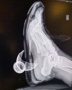 Foot injury with a glass of a Snapple bottle through the shoe and heel!