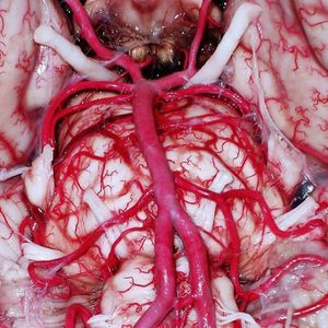 This is a system of arteries that sits at the base of the brain. The photo shows the basilar artery branching off into the vertebral arteries and cerebellar arteries (at the bottom) and the circle of Willis (at the top). These vessels branch from the internal carotid arteries on each side, which branches laterally into the middle cerebral artery that gives branches toward the front and back of the brain, into the anterior and posterior cerebral arteries. The paired arteries are interconnected and communicating, thus giving us the Circle of Willis, in a way that helps preserve blood flow in the brain.The middle cerebral artery is often invoked in the case of stroke, aneurysms, and rupture which subsequently leads to intracranial bleeding (subarachnoid hemorrhage) and is an emergency situation.