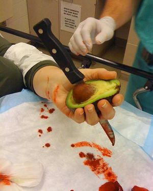 One unlucky event...and you thought you were having a bad day! Avocado slicing injuries are on the rise due to lack of handling skills. This patient accidentally stabbed her hand while trying to cut an avocado and remove the pit. Guess it's simply a matter of the knife slipping!