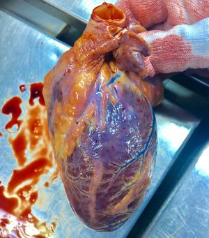 Cyanotic heart as a result of hanging - a classic forensic medicine case! Here are petechial hemorrhages seen on the epicardium of the heart. Petechiae (pinpoint hemorrhages) represent bleeding from small vessels and are classically found when a coagulopathy is due to a low platelet count. They can also appear following sudden hypoxia due to asphyxia and deprivation of blood supply (ischemia), thus confirming this case was a suicide by hanging. On postmortem examinations, there are non-specific physical signs used to attribute death to asphyxia. These include visceral congestion via dilation of the venous blood vessels and blood stasis, petechiae, cyanosis and fluidity of the blood. Notice the bluish vessels on the surface of the heart. The loss of oxygen is the reason veins are described as blue since they carry blood that has lost oxygen to the body's cells back to the lungs where it can be reoxygenated. As asphyxia progresses and more oxygen is depleted, a dark discoloration of the skin and tissues called cyanosis develops.