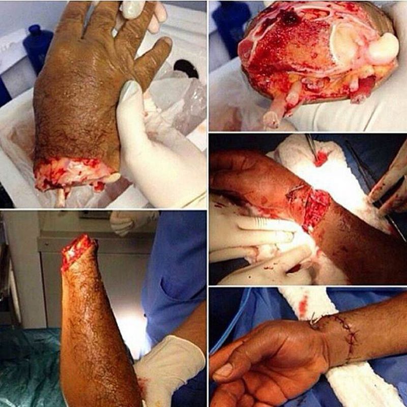 This poor guy had his hand chopped off due to an accident and underwent reattachment (replantation) of the amputated hand, which was placed in sealed plastic bag and ice water, back to its place. Replantation is the surgical reattachment of a body part, most commonly a finger, hand or arm, that has been completely cut from a person's body. It is possible to restore the function and survival of the replanted part, with the general operative sequence being the vascular shunt first to minimize ischemia time, bone fixation with or without shortening if needed, extensor tendon repair, artery repair, venous anastomoses, flexor tendon repair, nerve repair, and skin with fasciotomy in some cases to relieve tension or pressure and treat possible acute compartment syndrome. Nowadays, Technological advances and the use of the microscope have made possible the replantation of parts including thumbs, fingers, ears, scalps, facial parts, and genitalia.