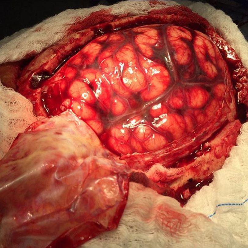 Left decompressive craniectomy in a middle aged woman that suffered from severe cerebral vasospasm resulting in MCA (middle cerebral artery) territory infarction. She presented with anisocoria (unequal size of the eyes' pupils) with left mydriasis (dilation of the pupil), and right sided hemiplegia. Decompressive craniectomy has been shown to reduce mortality in such cases. It is a neurosurgical procedure that is aimed to decrease the intracranial pressure by increasing cranial compliance. This is achieved by removing a part of the skull to allow a swelling brain room to expand out rather then being herniated downward transtentorially within the brain due to a mass effect with the accompanied increased intracranial pressure.