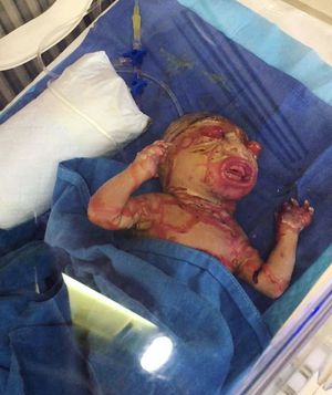 This rare condition has been given several names like harlequin ichthyosis, or collodion baby. A collodion baby is referred to the first expression of ichthyosis, a skin that resembles a yellow, tight and shiny film or dried collodion (sausage skin), which later on cracks and undergoes desquamation or peeling. This is a severe congenital disease, notice how the skin forms large, diamond-shaped plates that are separated by deep cracks (fissures). These skin abnormalities affect the shape of the eyelids, nose, mouth, and ears, and limit movement of the arms and legs. Restricted movement of the chest can lead to breathing difficulties and respiratory failure. Infants with harlequin ichthyosis often experience an excessive loss of fluids (dehydration) and develop life-threatening infections in the first few weeks of life. The hard outer layer eventually peels off, leaving the vulnerable inner layers of the dermis exposed which can lead to complications due to high risk of infection. Photo by @alikassem96