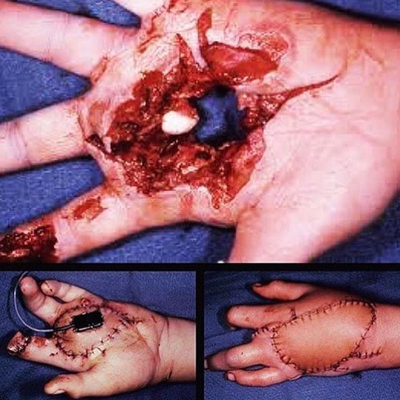 The result of a gun shot at close range! This patient was lucky to get a significant reconstructive surgery and repair later. Only the middle phalanx was lost!! Depending on the severity of the wound, appropriate measurements should be taken in the emergency department. The anatomy of the hand involves so many structure that an injury to an area may result in varying degrees of damage to different parts. The common hand injuries due to a gunshot are fracture on bones of the hand and fingers (the carpal bones, metacarpals, and phalanges), bone loss and instability, soft tissue injuries to the muscles, tendon and ligament injuries and damage to the nerve and blood vessels. Following a limited debridement (removing dead tissue from the wound), the fractures are managed with early fracture stabilization, internal/external fixation, reduction and splinting. Follow-up surgeries are indicated depending on the extent and severity of the injury. Bone grafting is used in some cases, while in others amputation of digits or the damaged parts may be required.