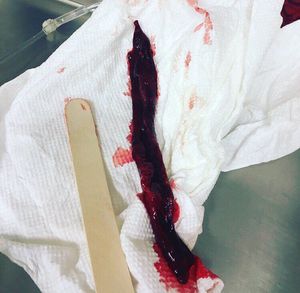 The picture above is of a clot that was seconds away from killing a patient.The 67 year old male came into the ER complaining of epistaxis. He just had a nasal surgery earlier that week and was on warfarin..During the initial exam of his posterior pharynx some bright red blood was seen but that was it. They placed a posterior packing and had the patient sitting up vertically slightly leaning forward.Shortly after, the wife comes out into the hall and says my husband cannot breathe!This is the actual clot they sucked out of the back of his posterior oropharyx occluding his trachea! Photo by @paboards