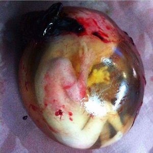 A spontaneously aborted or miscarried baby in its shiny little amniotic sac.