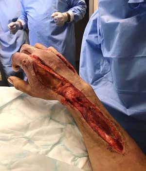 The result of a nasty infection called necrotizing fasciitis - the "flesh-eating infection/bacteria". Notice the puncture wound on the index, that's where the infection started. Chris (@chrisaksel) was on a military exercise when it happened. He had a bacterial infection in his throat for two weeks and streptococcal bacteries from his throat went in to the wound. At first his finger got swollen, and just after 30 minutes his whole hand was swollen and painful. Luckily enough, he got to the hospital in a rush, and if he had come in 30 minutes later they would have had to amputate his arm. Necrotizing fasciitis is a rapidly progressive inflammatory infection of the fascia, with secondary necrosis of the subcutaneous tissues. Typically the infection enters the body through a break in the skin such as a cut or burn. Unlike cellulitis, necrotizing fasciitis involves the deeper layers of tissue down to the deep fascia and it is caused by anaerobic bacteria or group A streptococci. Clinical manifestations include fever with an area of erythema. If not treated, the tissue begins to turn gray/black. It spreads quickly and aggressively from the primary infected area and beyond and can result in amputation, shock, and death if not treated by a combination of surgical exploration and debridement (removing the dead tissue - the video shows the result of it) with IV antibiotics. This patient had undergone a fasciotomy, a limb-saving procedure where the fascia was cut to relieve tension or pressure of the underlying tissue due to extensive necrosis. Photo by @chrisaksel