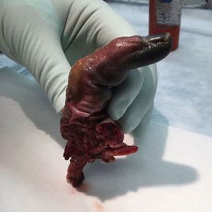 This patient has suffered a MRSA pyogenic flexor tenosynovitis leading to digital ischemic necrosis and amputation. He presented to the emergency department with right index finger pain and swelling a few days after sustaining a puncture wound. As seen in the picture, his finger had a flexed position on presentation and passive extension was painful. Pyogenic flexor tenosynovitis is the infection and inflammation of the synovial sheath that surrounds the flexor tendon of the finger. This is most commonly happens as a result of a penetrating trauma to the tendon sheath or from a direct spread from a septic joint or a deep space infection, with the majority of cases involving staph aureus and MRSA. Diagnosis is mainly clinical, and once diagnosed, surgical intervention is necessary, along with culture-specific IV antibiotics. If the finger can be salvaged, either closed tendon sheath irrigation or open irrigation and debridement (for severe cases) technique with a angiocatheter can be used.