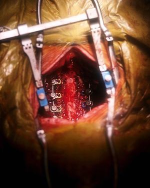 This is a close-up of an exposed spinal cord with screws on either side. Metal retractors are used to hold back the patient’s skin and flesh, providing the surgeons with access to the spine.