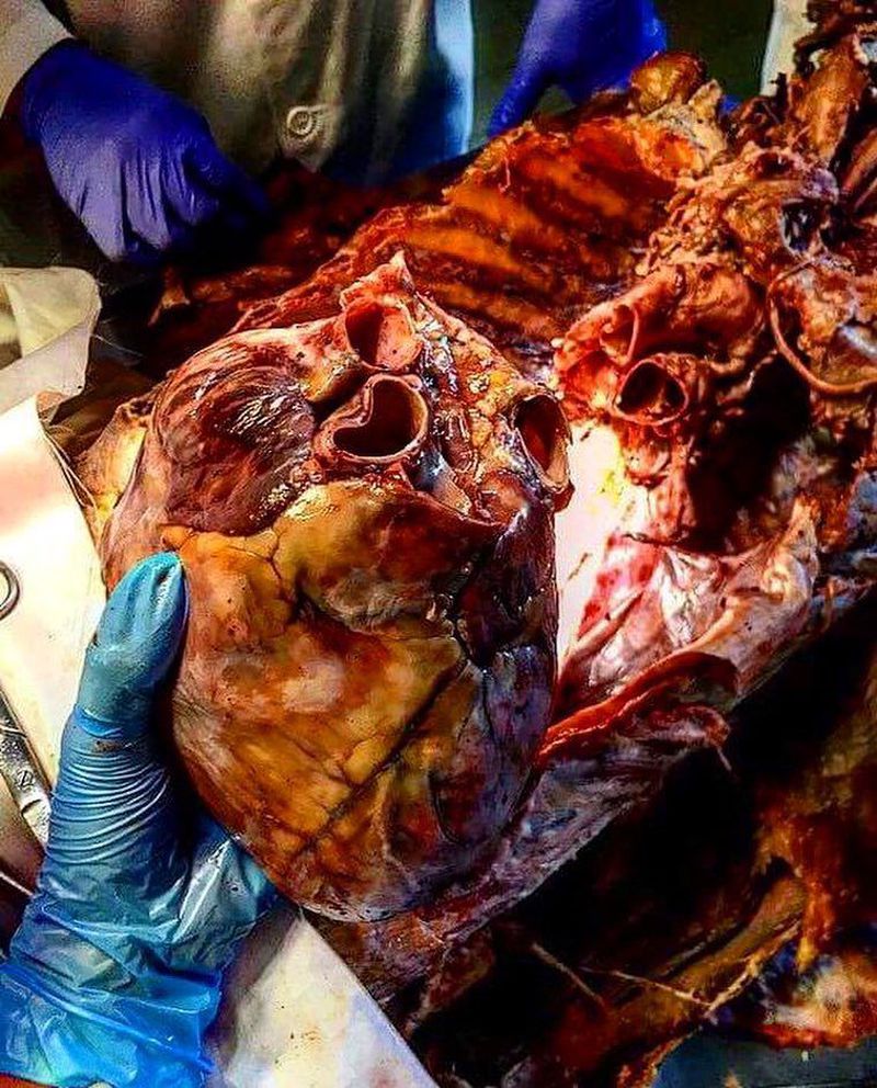 Look at the size of this massively enlarged heart! The size of a football! An enlarged heart, or cardiomegaly, is the term used to describe a heart that has a thickened wall or dilated chambers. Having a heart that is enlarged is not a disease but a symptom of an underlying medical condition. a cardiomegaly is usually found at autopsy in a patient who died from complications of morbid obesity, diabetes, and congestive heart failure. The normal male heart should fit in your hand, while this heart is 2-3x the normal size. There's a direct association of adiposity with left ventricular dysfunction, independent of hypertension, coronary artery disease and other heart diseases such as atrial or ventricular septal defects, mitral regurgitation and aortic stenosis, both leading to enlarged left ventricle and subsequent failure. Obesity produces an increase in total blood volume and cardiac output because of the high metabolic activity of excessive fat. Eventually, the heart grows larger to compensate for the larger body.Photo by @sallysammak