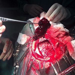 Subdural hematoma results in blood gathering between the inner layer of the dura mater and the arachnoid mater. Usually resulting from tears in bridging veins which cross the subdural space. As blood slowly builds up, it causes an increase in intracranial pressure which may cause compression and damage to the brain tissue. This patient presented to the emergency room with severe headache, vomiting and left hemiparesis (due to right sided hematoma) and rapidly deteriorated from a 13 Glasgow coma scale down to 6. The team rapidly proceeded to an emergency craniotomy and evacuation of the hematoma. Credit @rpaglioli