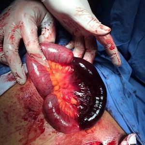 Intestinal ischemia occur when blood flow to the bowel (intestines) is decreased because of a blood vessel blockage.A volvulus describes the torsion of bowel around its mesentery. Torsion results in narrowing of the lumen at the point of rotation and compromise of the vessels that supply the torted gut, resulting also in a bowel obstruction.The mesentery may become so tightly twisted that blood flow to part of the intestine is cut off, resulting in ischemic bowel with necrosis or gangrene, seen in the image above. Symptoms can vary from severe abdominal pain, nausea and vomiting, to progressive injury to the intestinal wall, with accumulation of gas and fluid in the portion of the bowel obstructed. Necrotic bowel isn’t salvageable, so the surgeon may need to remove a portion of the intestine if tissue death has occurred with the anastomoses of the viable parts and restoration of blood flow.