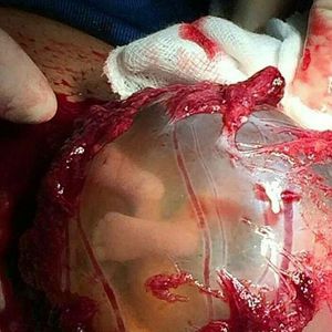 This baby was born via c-section with the sac still completely intact and his feet visible pressing against the clear membrane of the sac.