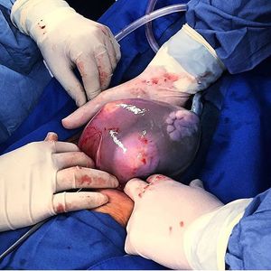 Cutest feet peeking from an enclosed amniotic sac during a C-section!