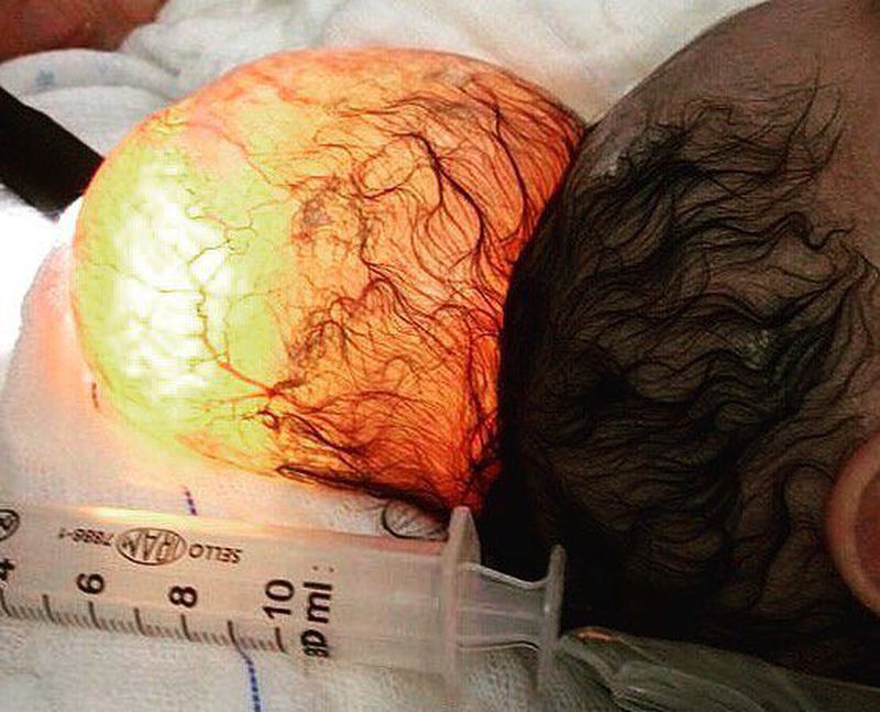 This is a rare condition called Meningoencephalocele, a type of encephalocele, which entails a protrusion of the meninges and brain through a congenital defect in the cranium (skull), usually in the frontal or occipital region.Hydrocephalus, abnormalities of the eyeball and tear duct, and other findings such as paralyzed arms and legs, seizures, ataxia, and microcephaly (small head) have been associated with the condition with some affected newborns have intellectual or physical disabilities while others have normal development and abilities.The majority of encephaloceles usually contain a degenerative cerebral cortex, which is often excised during reparative surgery. If the sac contains normal brain tissue, techniques such as ‘expan- sion cranioplasty’ and ‘ventricular volume reduction’ can be done to preserve the herniated brain. However, in most of the cases, herniated brain tissue is excised.Photo by @neurosurgerychair