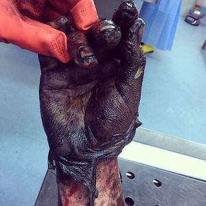 This is one of the first and most common autopsy findings. Burns of skin or other tissue are caused by fire, radiant heat, radiation, chemical, or electrical contact.Such findings help in the determination of the manner of death. The intensive heat and light emitted from electrical explosions cause severe burns, destroying skin and tissue. Victims sometimes require skin grafts or amputations but death is more likely with increased severity of burns, the body percent area affected and age of the individual. The victim may be thrown by the force of this pressure, which also adds up injuries from falling or colliding with nearby objects.Photo by @medizzy