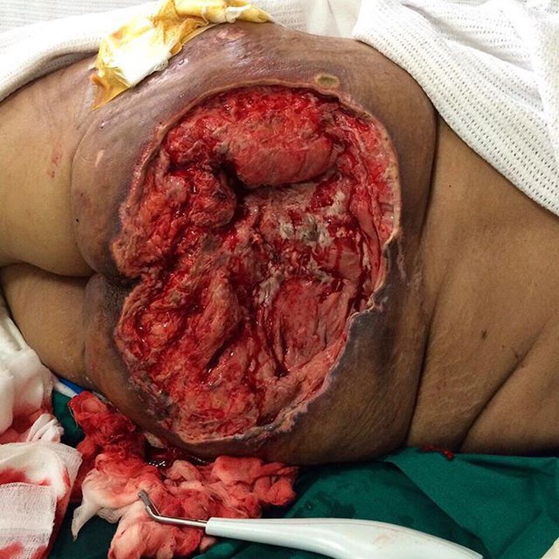 This is an extensive stage 4 full-thickness decubitus ulcer, bedsore, or pressure ulcer of the lower back and buttocks! This is a skin ulcer caused by prolonged pressure against the skin resulting in completely or partially obstructed blood flow to the soft tissue. The patients are risk are those who are paralyzed, bedridden, and debilitated patients. The best treatment is prophylaxis. In most cases, the use of special air mattresses prevents bedsores. Periodic skin inspection is necessary to detect the damage early enough. Cleanliness and dryness help prevent ulcer formation as well. Those lesions can ulcerate down to the bone and become infected, which further might lead to sepsis and death. Major skin breaks like the one seen above are treated with aggressive surgical debridement and antibiotics for the prophylaxis of possible infection.