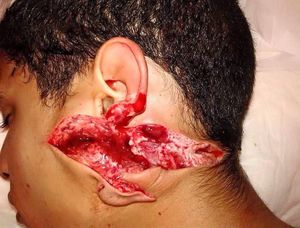 An elderly man and his wife were resting at home around 3:30pm when several guys broke into their home through a window, beat the hell out of the two of them, then began to separate the husband and wife – they were taking her to a different room.The husband began to panic, grabbed a decorative sword off the wall, and started slashing the robbers. The robbers fled to a car where an accomplice was waiting and sped away. They were chased by cops, crashed into a pole and were arrested.The photo shows one of the robbers who sustained a trauma to the head that sliced his ear and an additional hit to the hand.