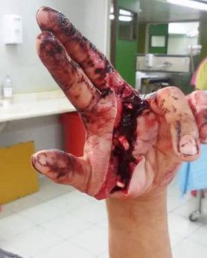 An elderly man and his wife were resting at home around 3:30pm when several guys broke into their home through a window, beat the hell out of the two of them, then began to separate the husband and wife – they were taking her to a different room.The husband began to panic, grabbed a decorative sword off the wall, and started slashing the robbers. The robbers fled to a car where an accomplice was waiting and sped away. They were chased by cops, crashed into a pole and were arrested.The photo shows one of the robbers who sustained a trauma to the head that sliced his ear and an additional hit to the hand.
