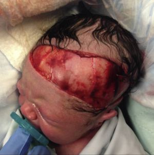 A newborn was transferred to our institution following emergency cesarean section that led to a severe scalping laceration. Repair of the injury was successful with good results. Most recent follow-up reveals no functional deficits.