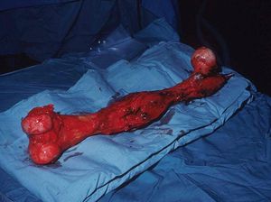 Ewing's sarcoma is more common in males (1.6:1 ) and usually presents in childhood or early adulthood, with a peak between 10 and 20 years of age. It can occur anywhere in the body, but most commonly in the pelvis and proximal long tubular bones, especially around the growth plates. The diaphyses of the femur are the most common sites, followed by the tibia and the humerus. Thirty percent are overtly metastatic at presentation. Patients usually experience extreme bone pain.Signs and symptoms include: intermittent fevers, anemia, leukocytosis, increased sedimentation rate, and other symptoms of inflammatory systemic illness. Also, depending on the type, progression, and location of the tumor - great pain may occur.According to the Bone Cancer Research Trust (BCRT), the most common symptoms are: localized pain, swelling, and sporadic bone pain with variable intensity. The swelling is most likely to be visible if the sarcoma is located on a bone near the surface of the body, but when it occurs in other places deeper in the body, like on the pelvis, it may not be visible.Almost all patients require multidrug chemotherapy as well as local disease control with surgery and/or radiation.If the interest is shown we may post about the surgical procedure with femural replacement!