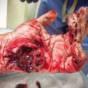 This 36 year old patient was cleaning his H&K USP Compact .45 gun when it accidentally got discharged into his left hand. You can never be too careful while handling a gun! .Who can name any of the hypothenar muscles that are damaged in this case? :)