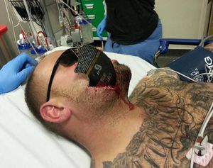 This man was injured as the blade of the angle grinder he was using shattered at high speed. He sustained deep wounds to his right cheek. His wounds were debrided and closed in layers. He recovered well post operatively.Injuries resulting from the use of angle grinders are numerous. The most common sites injured are the head and face. The high speed disc of angle grinders does not respect anatomical boundaries or structures and thus the injuries produced can be disfiguring, permanently disabling or even fatal.