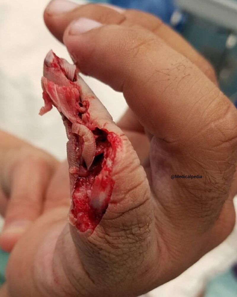 Case of a saw accident where the finger went through a buzz saw while building a table for a wedding present. The finger was later amputated at the MCP joint but that didn't stop him from finishing the table. Power saws are extremely useful tools, however, they also have the potential to cause serious hand injuries. Any structure that comes into contact with the saw blade can potentially be injured. Deeper injuries can damage the tendons and muscles that move the fingers, thumb, and wrist, affecting the way they move. Nerves may be cut, resulting in loss of feeling and/or loss of ability to control certain muscles. Circulation may be lost if the arteries are injured. Fractures may result, which can be in the shaft of the bone or in the joint. Tendon and nerve injuries may need to be repaired, but if too much shredding has occurred or there is excessive loss of the tendon and/or nerve tissue, repair may not be feasible. Fractures may need repair with pins, wires, or plates and screws. If a joint is severely damaged, it may need to be fused permanently. Some amputations may be able to be replanted, but if there is too much shredding, it may not be feasible. Amputation of a single finger may be better treated by leaving it off, as the reattached finger may impair the function of the rest of the hand.
