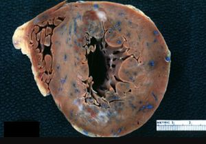 Gross focal myocardial scars and hyperemia chronic ischemic heart disease same as slide 89 but close-up.