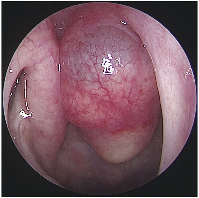 A 60-year-old man presented to the otorhinolaryngology clinic with a feeling of nasal obstruction and postnasal drip that had developed 10 years earlier and had worsened over the past month. He also had a sensation of a foreign body in his throat. Symptoms worsened when he was lying flat. On physical examination, no deviation of the nasal septum or hypertrophy of the inferior turbinates was detected. Nasopharyngoscopy revealed a smooth, pink, cystic mass in the midline of his nasopharynx, with no obstruction of the openings to the eustachian tubes (the image shows the view through the right naris). Computed tomography of the head revealed a 2.5 cm by 1.3 cm by 1.4 cm cystic tumor in the midline of the nasopharynx without intracranial extension. The findings were consistent with Tornwaldt’s cyst, a benign cyst that arises between the roof of the nasopharynx and the remnant of the notochord. Because the patient was symptomatic, he underwent surgical marsupialization of the cyst. On follow-up examination 3 months after surgery, he no longer had the sensation of a foreign body in his throat, his nasal symptoms were reduced, and there was no recurrence of the cyst.
