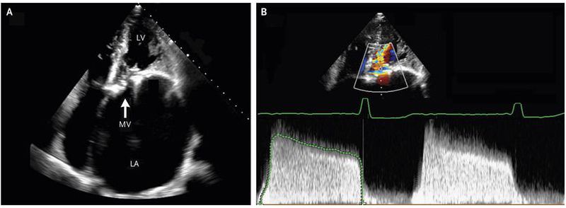 A 47-year-old man presented to the emergency department with a 6-month history of worsening exertional dyspnea. He had recently emigrated from Honduras and had a history of cardiac surgery as a child, but the initial diagnosis and specific procedure that had been performed were not known. The physical examination revealed a right parasternal heave, a loud S1, a midpeaking systolic ejection murmur (grade 2/6) at the upper sternal border, and a low-pitched diastolic rumble at the apex. An electrocardiogram showed atrial flutter with variable atrioventricular conduction. Transthoracic echocardiography revealed moderate aortic stenosis (calculated valve area, 1.3 cm2) and very severe mitral stenosis (calculated valve area, 0.5 cm2) ( Panel A; LA denotes left atrium, LV left ventricle, and MV mitral valve). The left atrium was enlarged, with an indexed atrial volume of 364 ml per square meter (normal value, <35). Color-flow Doppler images (Panel B, upper half) and a continuous-wave Doppler flow pattern (Panel B, lower half) showed the stenotic mitral valve during diastole. The continuous-wave Doppler flow pattern depicts flow velocity (vertical axis) and time (horizontal axis). The slow decline in transmitral flow velocity reflects the very slow decrease in left atrial pressure and slow increase in left ventricular diastolic pressure that occur in mitral stenosis. The mean transmitral gradient was 14 mm Hg (normal value, <3). The patient underwent replacement of the mitral and aortic valves with mechanical prostheses. At a 6-month follow-up visit, he had only slight limitations on physical activity (New York Heart Association class II).