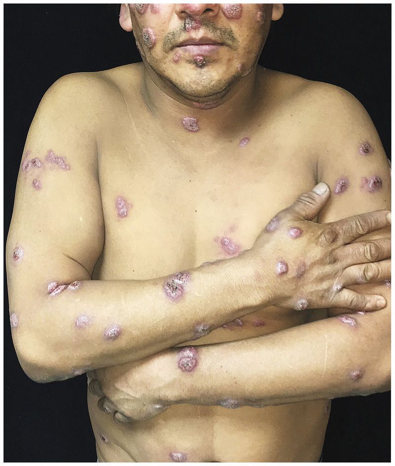 A 44-year-old man presented to the dermatology clinic with nonpruritic skin lesions over his body, including the face, chest, back, arms, and legs. Six months earlier, he had had fever, cough, and vomiting for 1 week. Subsequently, multiple nodules had appeared over his body. He worked in construction and reported no recent travel, exposure to pets, or contact with sick persons. A physical examination revealed numerous scattered crusted nodules and plaques that had indurated violaceous borders (shown). His lungs were clear to auscultation, and there was no notable lymphadenopathy. A radiograph of the chest did not show an infiltrate. The complete blood count was normal, and tests for human immunodeficiency virus infection and syphilis were negative. A fungal culture of skin tissue was negative; however, a skin biopsy showed pseudoepitheliomatous hyperplasia, intraepidermal neutrophilic abscesses, and round yeast forms with broad-based budding. Grocott methenamine–silver staining and mucicarmine staining confirmed a diagnosis of disseminated cutaneous blastomycosis, a pyogranulomatous fungal infection of Blastomyces dermatitidis or B. gilchristii. Patients may present with primary pulmonary infection or with disease that has spread hematogenously to the skin, bones, genitourinary tract, or central nervous system. This patient received treatment with itraconazole for 6 months; significant flattening of the lesions was observed at a follow-up visit 6 weeks after presentation.