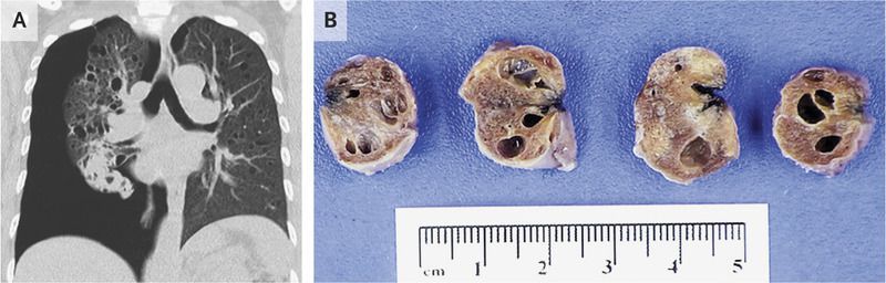 A 44-year-old woman presented to the emergency department with acute chest pain after several months of progressive dyspnea. Her oxygen saturation was 92% while she was breathing ambient air, and the physical examination was notable for diminished breath sounds on the right side. Computed tomography of the chest, reconstructed in the coronal plane at the level of the tracheal carina, revealed a large pneumothorax and diffuse, intraparenchymal pulmonary cysts (Panel A). The patient underwent mechanical pleurodesis, and a wedge biopsy was performed. The biopsy specimens contained numerous thin-walled cysts (Panel B). Spindle cells coexpressing smooth-muscle and melanocytic markers lined the cyst walls, which confirmed the diagnosis of lymphangioleiomyomatosis, a rare condition that can affect women of all ages, with the average age at diagnosis in the late 30s to early 40s. Symptoms may occur sporadically or in association with tuberous sclerosis complex. Activation of the mechanistic (formerly mammalian) target of rapamycin (mTOR) signaling pathway causes aberrant cell proliferation and lymphangiogenesis. Several weeks after the patient’s presentation, recurrent sharp chest pain and dyspnea developed. Chest radiography revealed a contralateral spontaneous pneumothorax resulting from cyst rupture. After pleurodesis, her dyspnea persisted, and pulmonary-function testing revealed a forced expiratory volume in 1 second (FEV1) that was 44% of the predicted value. Within 3 months after the initiation of therapy with sirolimus, an mTOR inhibitor, her exercise tolerance had improved (with an FEV1 that was 67% of the predicted value), but she continued to have fatigue and chest discomfort and had not returned to work.