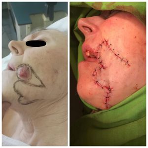 Exulcerated basalioma removel from the face.,, bi-lobe''-flap reconstruction
