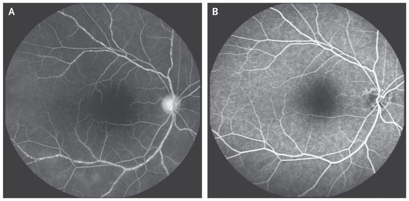 A 25-year-old woman with newly diagnosed Takayasu’s arteritis was referred to the ophthalmology clinic because of a 4-week history of gradual, painless loss of vision in both eyes. Ophthalmologic examination revealed severe impairment, with perception of only light in the right eye and hand motion in the left eye. Slit-lamp examination showed normal anterior segments. Funduscopic evaluation revealed impaired circulation in retinal arteries and veins, and fundus fluorescein angiography showed segmented retinal blood flow (also known as “boxcarring”). Takayasu’s arteritis is a rare, systemic, large-vessel vasculitis. Impairment of vision is associated with involvement of the carotid and vertebral arteries and their branches that leads to decreased perfusion of the eye. The patient underwent percutaneous endovascular stenting of the common carotid and vertebral arteries and initiated treatment with oral glucocorticoids and azathioprine. At follow-up 4 weeks later, repeat fundus fluorescein angiography showed that the retinal blood flow had improved and was no longer segmented . Visual acuity measured 20/400 in the left eye, and perception remained limited to light in the right eye.
