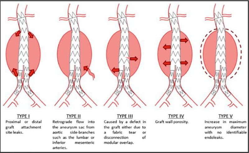 Classification of endoleaks. Endoleaks are characterized by persistent blood flow within the aneurysm sac following endovascular aneurysm repair (EVAR). Normally the aortic stent-graft used for EVAR excludes the aneurysm from the circulation by providing a conduit for blood to bypass the sac.