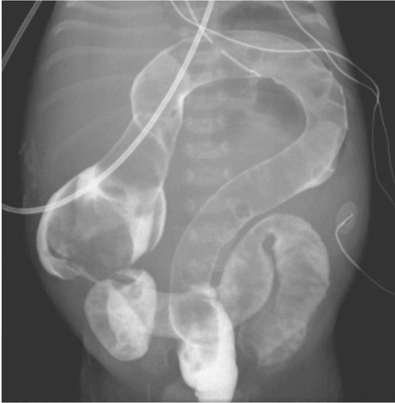 A baby boy born at 39 weeks of gestation to a 28-year-old woman had bilious emesis, failure to pass meconium, and abdominal distention within 24 hours after birth. Abdominal radiography revealed dilated bowel, a finding consistent with a distal obstruction. A water-soluble contrast enema showed a uniformly distended and shortened colon that appeared in the shape of a question mark, a finding consistent with total colonic aganglionosis. A specimen obtained at the bedside by transanal suction rectal biopsy had no ganglion cells found on hematoxylin and eosin staining, a negative result on calretinin staining, and abnormally thickened nerve fibers. These findings confirmed the diagnosis of Hirschsprung’s disease, a congenital absence of enteric ganglion cells resulting in a loss of bowel motility in affected areas. The patient was taken to the operating room, where laparoscopic serial frozen-section biopsy specimens of the entire colon were obtained and no ganglion cells were identified. Abundant ganglion cells were found at the level of the terminal ileum, and an end ileostomy was performed. Six months later, the patient underwent a colectomy with stapled side-to-side anastomosis of the terminal ileum to the rectal remnant (Duhamel procedure). At the postoperative visit, the infant was having five to eight bowel movements daily and was growing well.