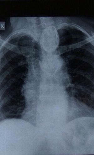 X ray of a female patient having mild cardiomegaly and retrosternal thyroidism