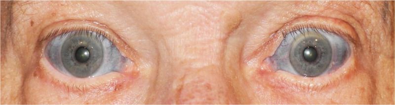 A 70-year-old man presented to the ophthalmology clinic with a 1-year history of progressive bluish discoloration of the sclerae of both eyes. He reported no ocular discomfort or blurry vision. He had previously received a diagnosis of an inflammatory arthritis for which he had been taking minocycline at a dose of 100 mg daily for more than 15 years. Ophthalmologic examination was notable for a bluish discoloration of the sclerae. Extraocular movements were intact, and the pupils were equal and reactive to light. Best corrected visual acuity, visual fields, and intraocular pressure were normal. Ocular coherence tomography showed no scleral thinning. Bluish discoloration of the pinnae of both ears was also noted. Minocycline-induced pigmentation was diagnosed. Prolonged treatment with minocycline can cause blue-gray pigmentation of the skin, sclerae, pinnae, fingernails, teeth, gums, and scar tissue. A proposed mechanism for this pigmentation is that metabolites of minocycline form insoluble complexes with melanin or iron that can deposit in body tissues, particularly in tissues that are exposed to light. The staining may resolve slowly, or it can be permanent. The patient returned to the referring rheumatologist, who, following the recommendation of the ophthalmologist, advised him to stop taking minocycline. At a follow-up visit 1 year after treatment with minocycline was stopped, minimal reduction in the scleral pigmentation was noted.