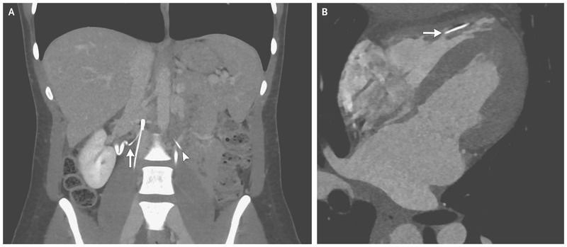 A 28-year-old woman presented to the emergency department with pain in the right flank. Her medical history was notable for nephrolithiasis as well as for deep venous thrombosis and pulmonary embolus that had occurred 10 years earlier and for which she had received an inferior vena cava filter that had not been retrieved. Computed tomography (CT) of the abdomen revealed a fragmented inferior vena cava filter with multiple perforated struts. One strut was approximately 1 mm from the right ureter (Panel A, arrow). Whether this finding was related to the flank pain or was incidental was unclear. Two additional struts had fractured and embolized — one to the left prevertebral space (Panel A, arrowhead) and one to the right ventricle. Cardiac CT angiography revealed that the strut was within the right ventricular trabeculae with no evidence of perforation (Panel B, arrow). The inferior vena cava filter was retrieved with endovascular intervention. The patient’s flank pain resolved with only supportive care before the retrieval of the filter. After consideration of the risks of an intervention to retrieve the struts, a decision was made to leave the embolized struts in place. Fracture of inferior vena cava filters is a potential complication of these devices. At follow-up after the filter retrieval and at 1 year after presentation, the patient was feeling well, and she is being monitored clinically.