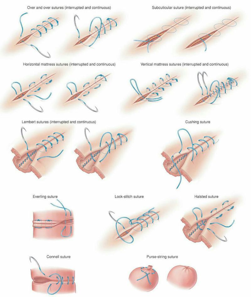 Suturing Techniques: General Principles: Many varieties of suture material and needles are available. The choice of sutures and needles is determined by the location of the lesion, the thickness of the skin in that location, and the amount of tension exerted on the wound. Regardless of the specific suture and needle chosen, the basic techniques of needle holding, needle driving, and knot placement remain the same.
