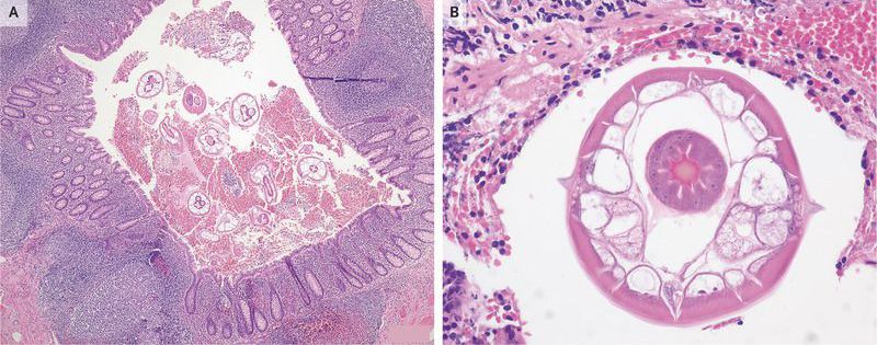 A 45-year-old man with a 1-day history of abdominal pain and loss of appetite presented to the emergency department. He did not have a fever. Physical examination revealed tenderness in the right lower quadrant of the abdomen. Rebound was present; Blumberg’s sign was negative. Laboratory results included a normal white-cell count, with 82% neutrophils. Abdominal ultrasonography was performed, but the results were inconclusive with regard to the presence or absence of appendiceal inflammation. An appendectomy was performed. The appendix was grossly normal, but pathological analysis revealed the presence of Enterobius vermicularis in the appendiceal lumen (Panels A and B, hematoxylin and eosin) and mild inflammation of the mucosa. E. vermicularis, known as pinworm, is a nematode that is most commonly found in young children, although adults can also be infected. The gravid female pinworm attaches to tissue near the cecum and migrates to the anus to deposit its eggs, which can cause perianal pruritus. Autoinfection and transmission occur through the ingestion of eggs from contaminated hands, bathroom fixtures, bedding, food, and other sources. It is difficult to determine definitively whether the presence of pinworm in the appendix was the cause of the patient’s presenting symptoms or was an incidental finding. After the appendectomy, the patient and his family were treated with mebendazole. At follow-up 6 months after surgery, the patient was asymptomatic.
