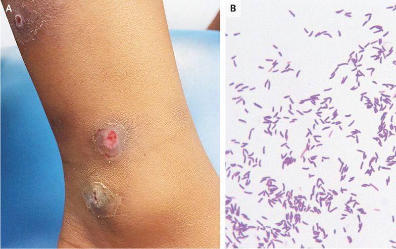 A 5-year-old, fully vaccinated girl was brought to the emergency department with pruritic lesions on both legs. She had recently returned from a trip to Sierra Leone. The lesions had appeared 3 weeks into her stay there and had increased in size and ulcerated. On presentation, she was afebrile, and an area over the medial aspect of the left lower leg was ulcerated and bleeding (Panel A). The C-reactive protein level was mildly elevated, and the white-cell count was normal. Empirical treatment with oral floxacillin was initiated, and a skin swab was sent for culture, which grew Staphylococcus aureus, group A streptococcus, and Corynebacterium diphtheriae. Gram’s staining showed predominantly gram-positive bacilli characteristic of corynebacterium (Panel B). An immunodiffusion test (Elek’s test) was positive, indicating that this diphtheria was toxin-producing. Early manifestations of cutaneous diphtheria can appear as nonhealing, well-demarcated ulcers. After the detection of diphtheria in this patient, the antibiotic agent was changed to clarithromycin. Contact tracing was undertaken, and chemoprophylaxis was given to household contacts. At follow-up 1 week after the change in antibiotics to clarithromycin, the skin lesions had fully healed.