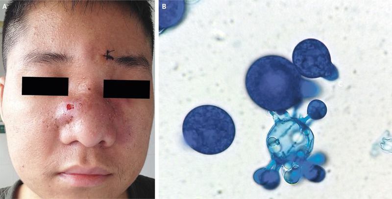 An immunocompetent 22-year-old man from southern China presented to the dermatology clinic with a 3-month history of progressive nasal and maxillofacial swelling. He reported that during the past 3 years he had had episodes of facial swelling for which he had received multiple treatments, including glucocorticoids and antibiotics. The physical examination revealed erythema, edema, and tenderness over the nasal dorsum and forehead, extending to the soft tissue around both eyes (Panel A), that correlated with soft-tissue thickening on computed tomography. Biopsy specimens were obtained from multiple sites, including the forehead and the nose. Histopathological examination of a specimen from inside the nose revealed granulomatous inflammation and fungal elements surrounded by eosinophilic material. A fungal culture grew Conidiobolus coronatus (Panel B), the identity of which was confirmed by polymerase-chain-reaction assay. Rhinofacial entomophthoromycosis was diagnosed. Conidiobolomycosis, a type of entomophthoromycosis, is a rare subcutaneous mycosis that can occur in immunocompetent persons in tropical and subtropical regions. It affects the upper respiratory mucosa and adjacent subcutaneous tissues. Infection probably results from the inhalation of fungal pathogens or from trauma. The patient received itraconazole, trimethoprim–sulfamethoxazole, and a 10% potassium iodide solution for 6 months, and the symptoms had fully resolved without relapse after 1 year of follow-up.