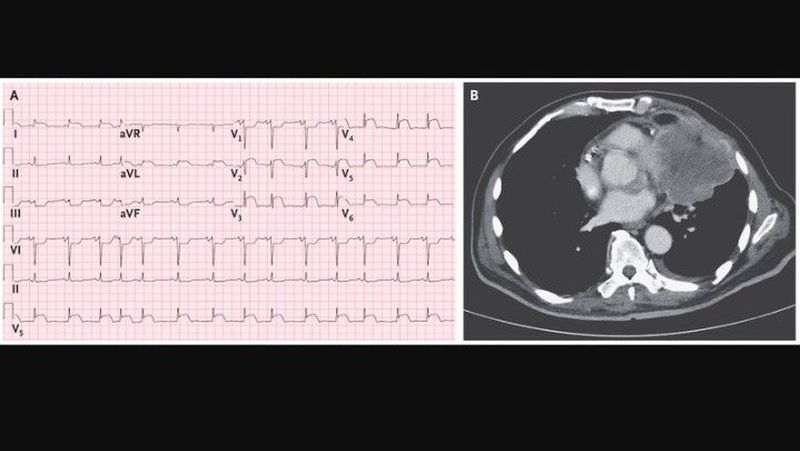 An 84-year-old man presented to the emergency department with generalized weakness and shortness of breath. Electrocardiographic results aroused concern that he had an ST-segment elevation myocardial infarction (STEMI), and the patient was transferred to a hospital that had a cardiac catheterization laboratory. On arrival at the second hospital, the patient had no chest pain. An electrocardiogram showed ST-segment elevation in leads I, aVL, and V2 through V6(Panel A). The troponin I level was 0.15 ng per milliliter (reference value, <0.03). On further discussion with the patient and review of the records, it was discovered that the patient had been hospitalized 1 month earlier because of unintentional weight loss. Computed tomography (CT) of the chest at that time revealed a large intrathoracic mass invading the left ventricle (Panel B). CT-guided needle biopsy during that hospitalization revealed poorly differentiated non–small-cell carcinoma. An electrocardiogram during that hospitalization showed ST-segment elevations in a similar pattern, but they had become more prominent by the time of the second admission. This pattern was thought to be due to tumor invasion of the myocardium, and coronary angiography was not performed. After a discussion of treatment options with the patient and his family, the decision was made not to pursue surgery or chemotherapy. Goals of care were transitioned to focus on the patient’s comfort, and he died several days later.