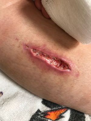 this is my athletes surgical incision from Monday... wound is shallower and not as long but the wound is wider. Athlete saw team physician and was prescribed an oral antibiotic. Athlete is completely grossed out and freaking out about her open wound. We have been applying neosporin with a non adhesive pad and wrapping it and at night she lets it air out.