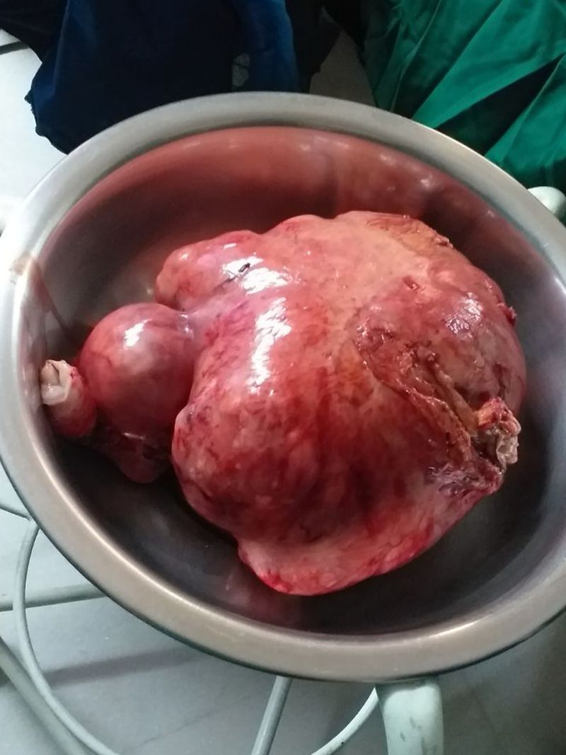 This mass is operated out from a 39 year old female patient. First we were of the openion that it would be a case of ovarian cyst adenoma. But later came to the conclusion that it is a uterine mass. Most probabaly a fibroid or could be endometriosis.