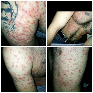 case:- A 23 yrs old refugee male presented with the above pictures for 4 days which first started in the right armpit then to shoulder then all over the body except palms, they are painful, itchy during exposure to air (cold air),sometimes has mild fever especially during nights . . Your thoughts? Why to such extend?